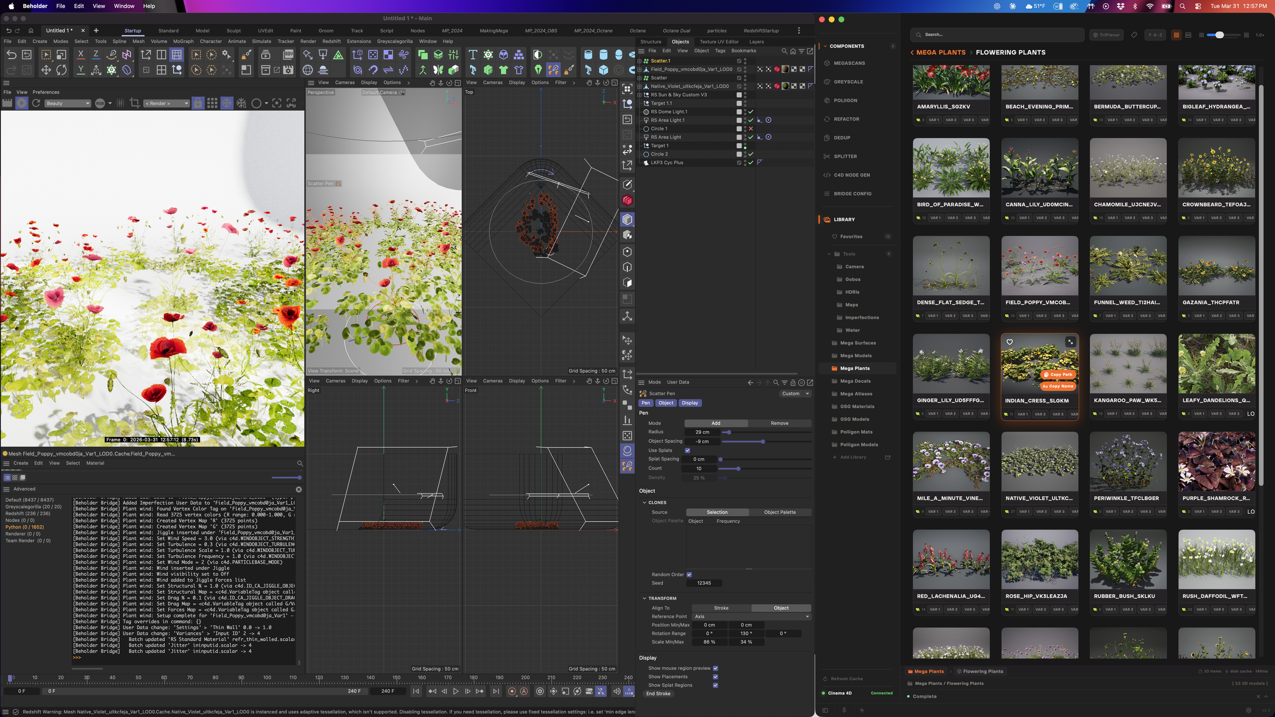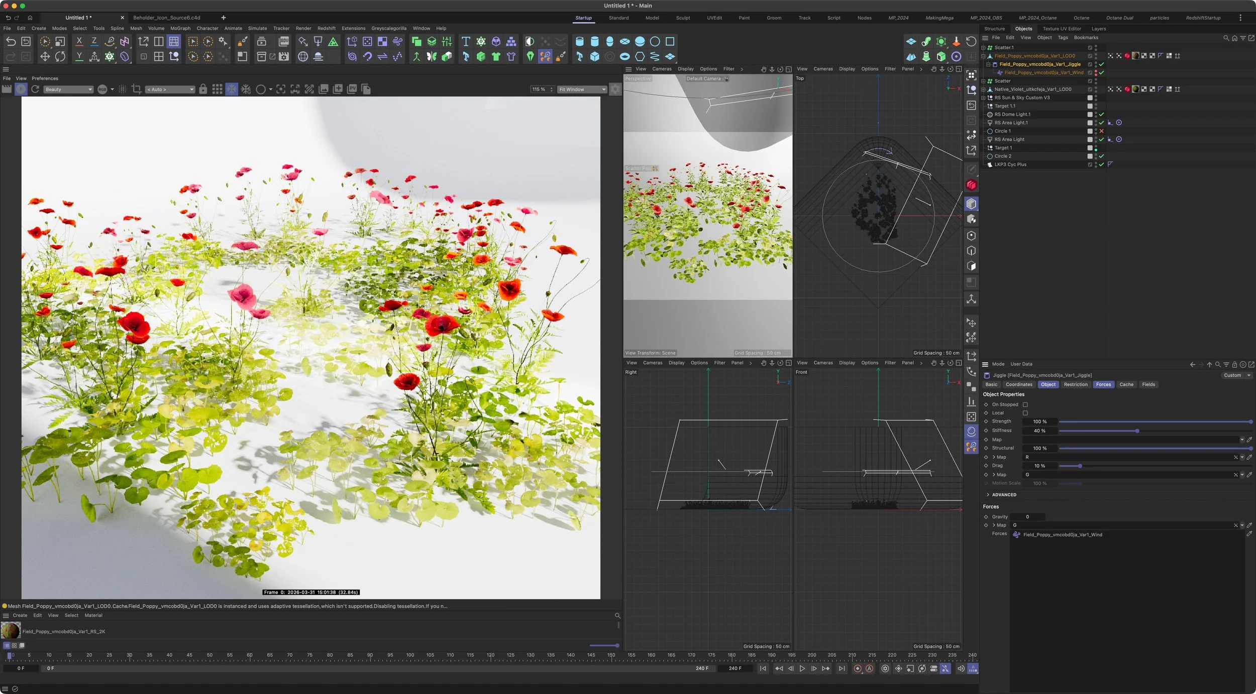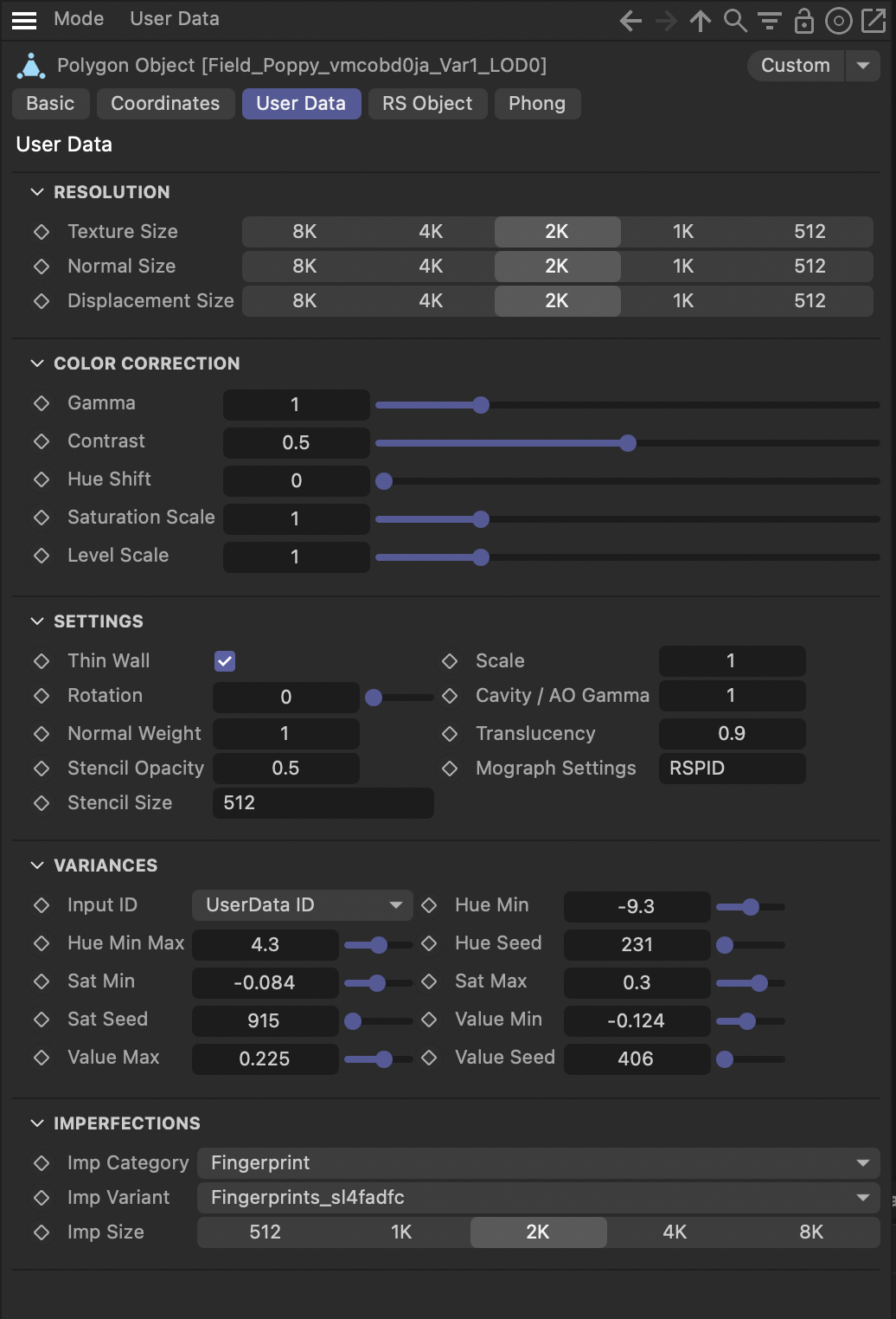 Switch texture resolution from 512 to 8K without reimporting. Swap LOD geometry while preserving transforms and materials. Cycle through plant variants; each with their own FBX, their own LODs, their own textures. All through User Data drop-downs right in the Cinema 4D Attribute Manager.