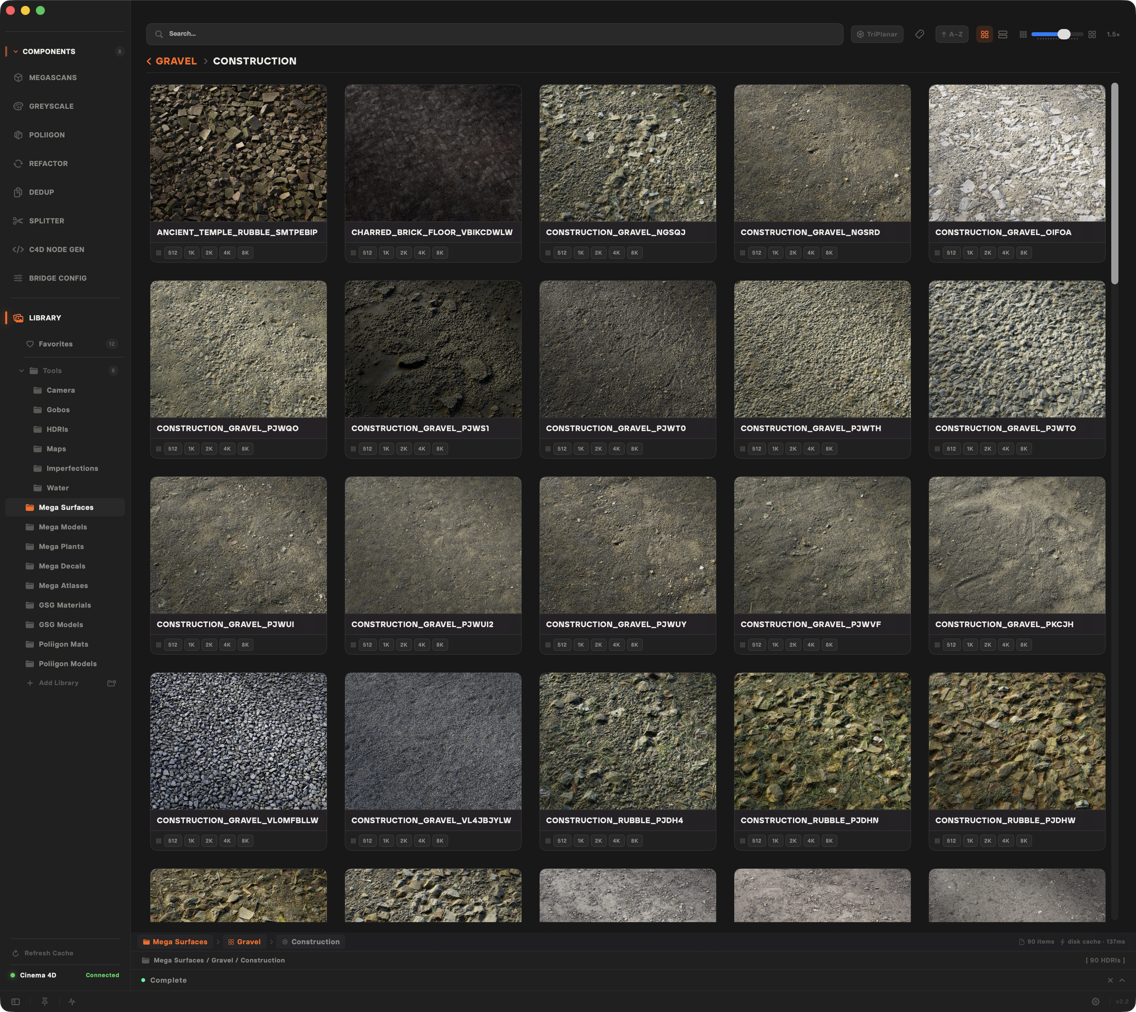 Point Beholder at any custom libraries on your hard drive. It scans, classifies, and indexes everything from surfaces, 3D models, HDRIs, plants, atlases, and decals into a browsable grid with resolution-aware thumbnails, favorites, custom groups, and global search.