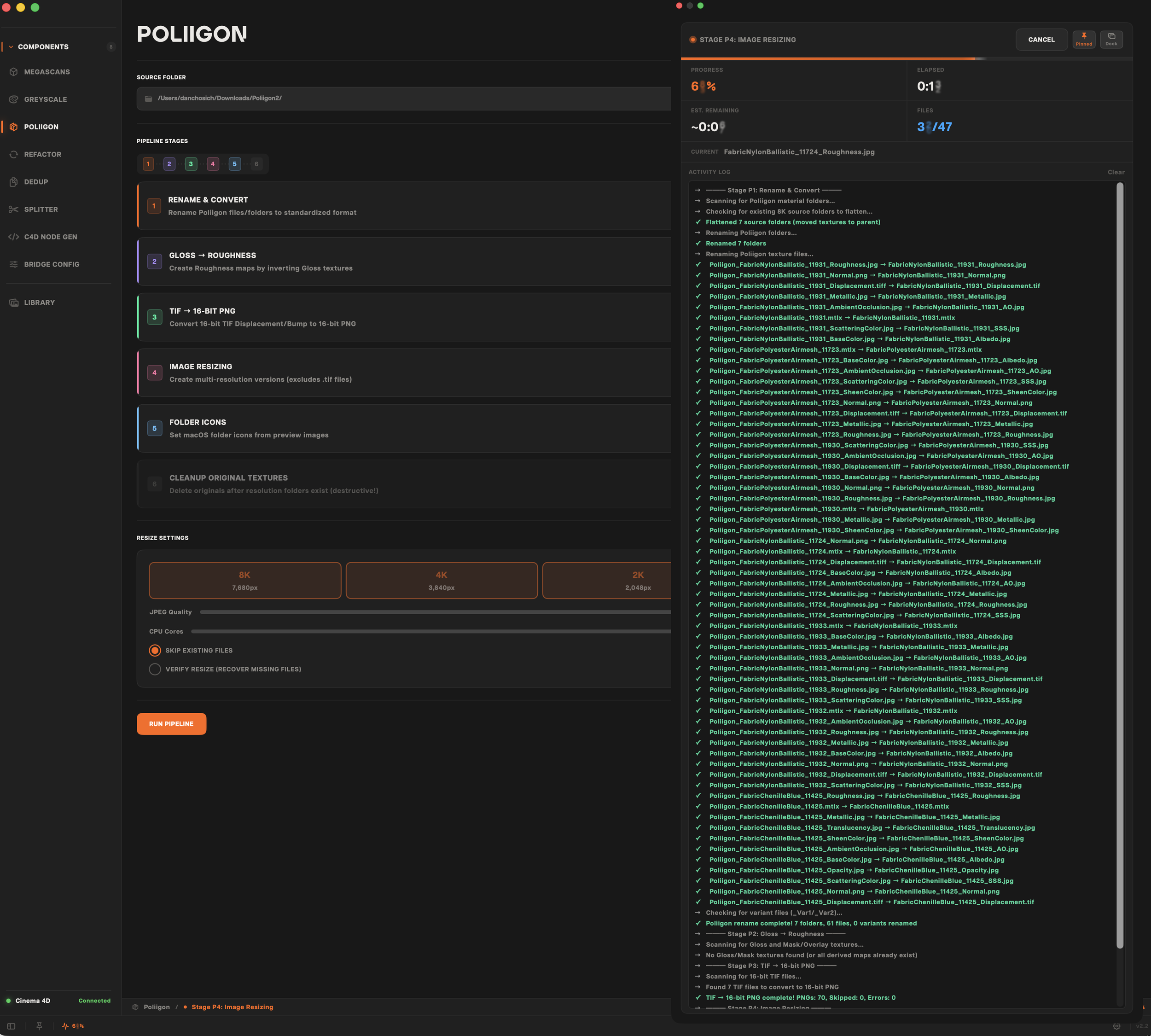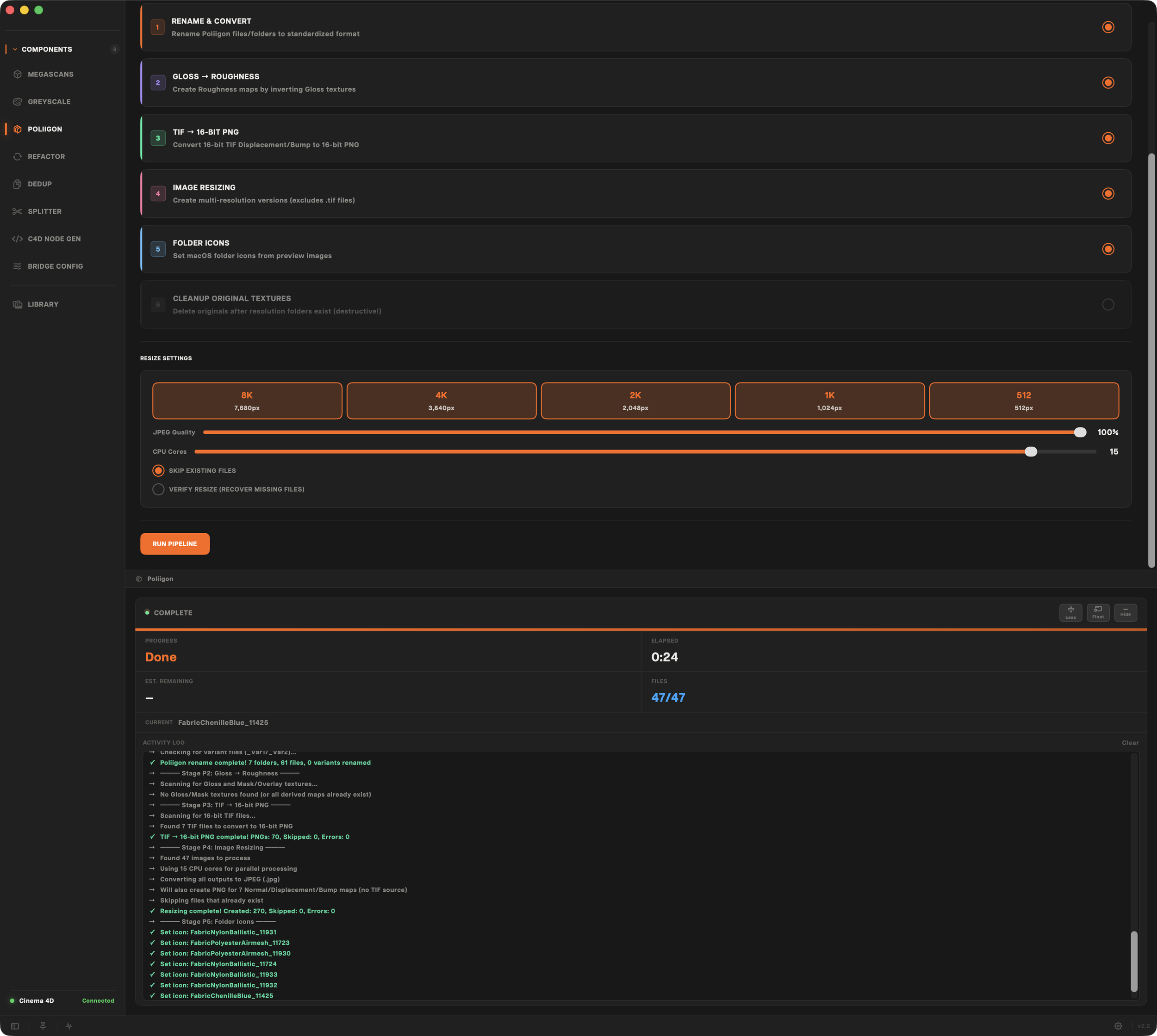 Cascade resizing creates 512, 1K, 2K, 4K, and 8K variants. EXR displacement maps convert to 16-bit PNGs. Configurable JPEG quality and core count.