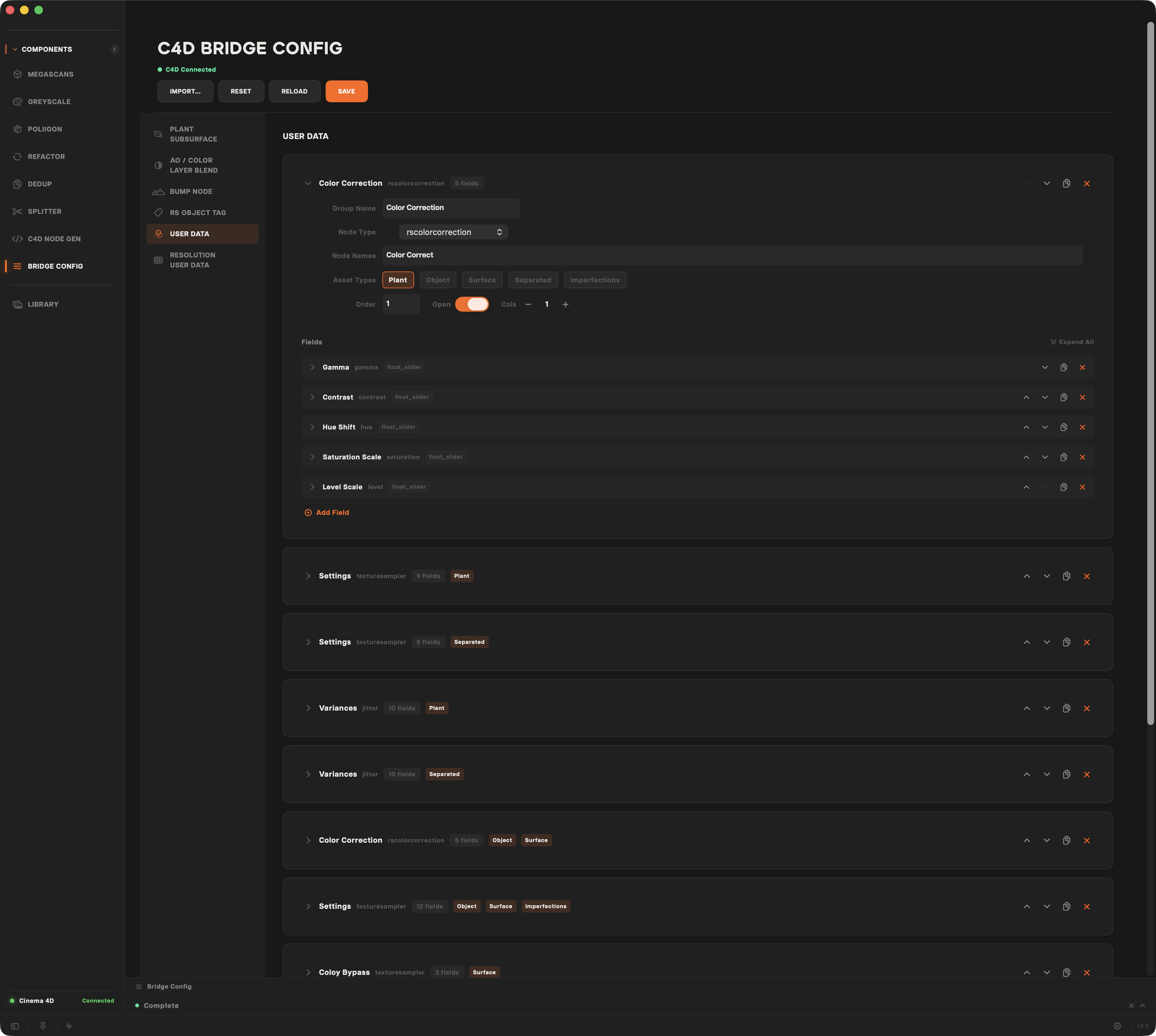 Bridge Config creates custom User Data fields on every imported material with sliders, drop-downs, color pickers, toggles, and text fields that control Redshift node ports in real time. Adjust Roughness Blend, TriPlanar scale, random UV offset, or imperfection intensity without opening the node graph. The plugin polls every 500ms and applies changes instantly.