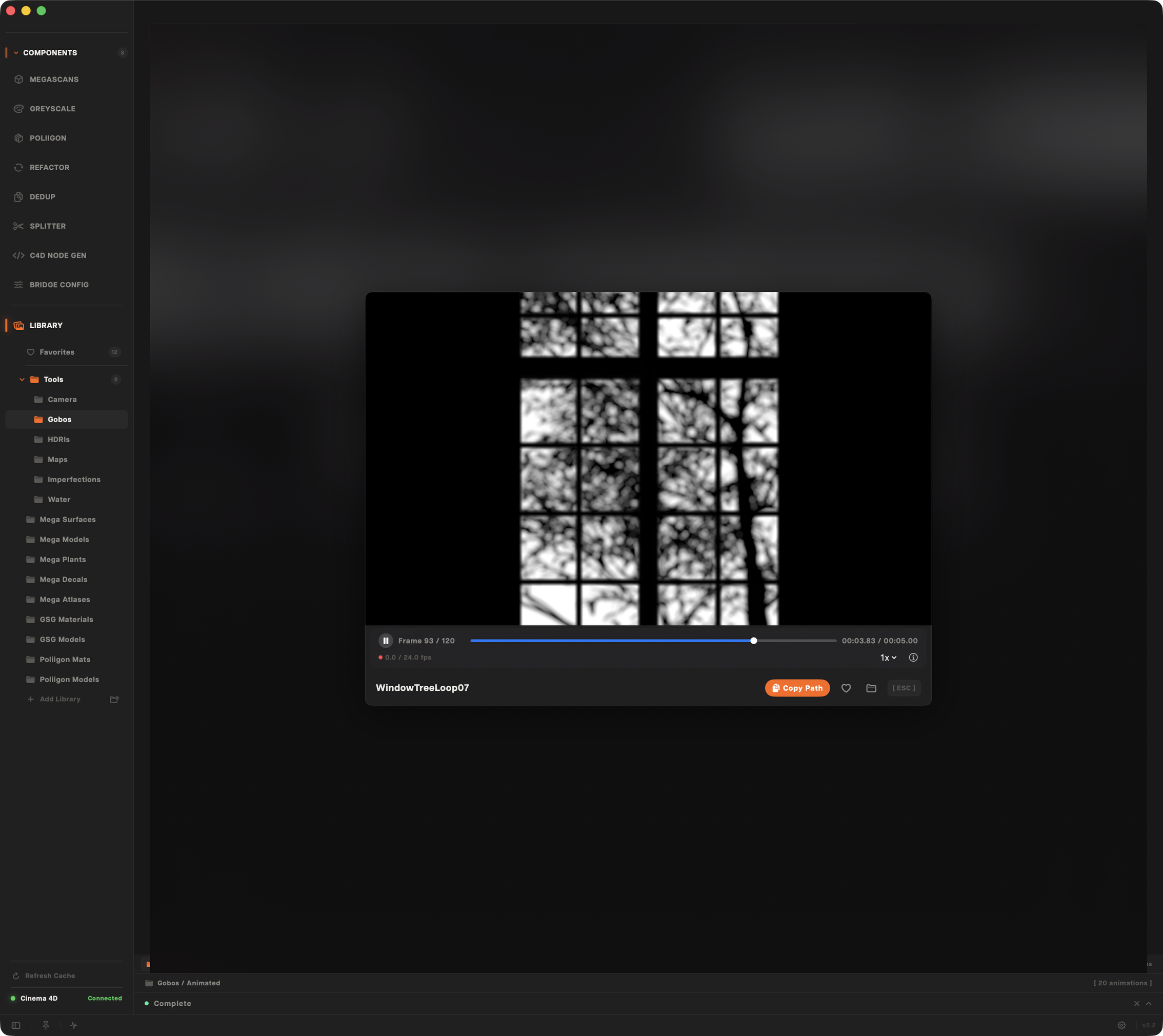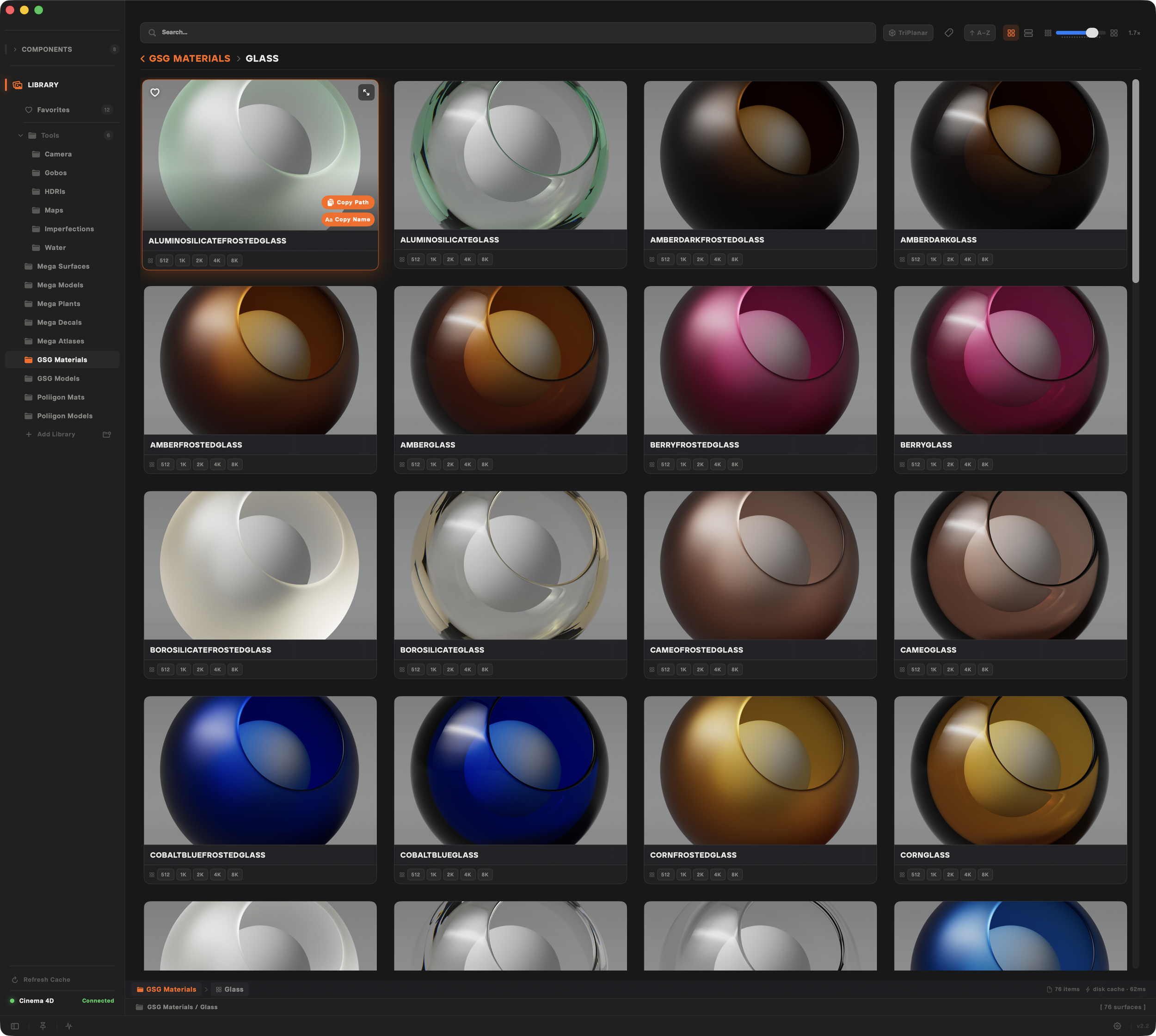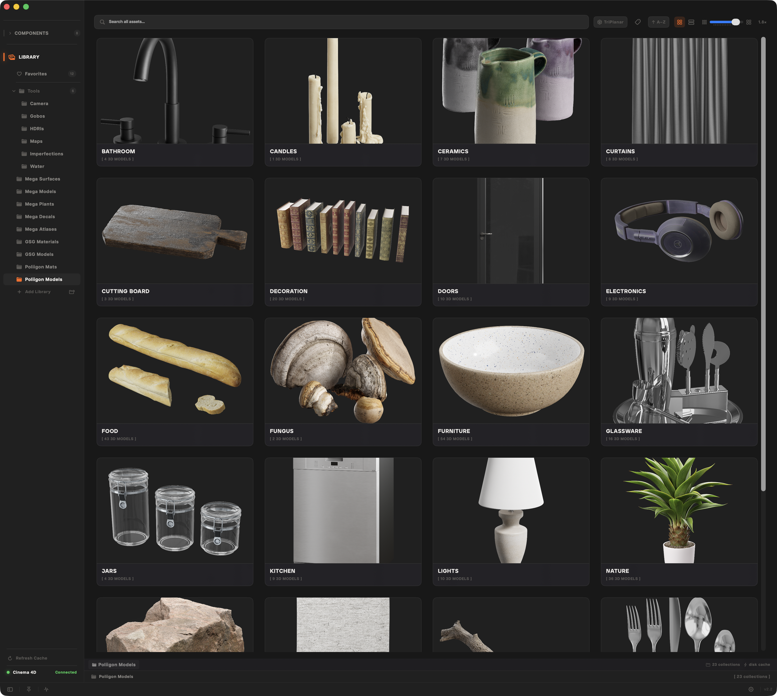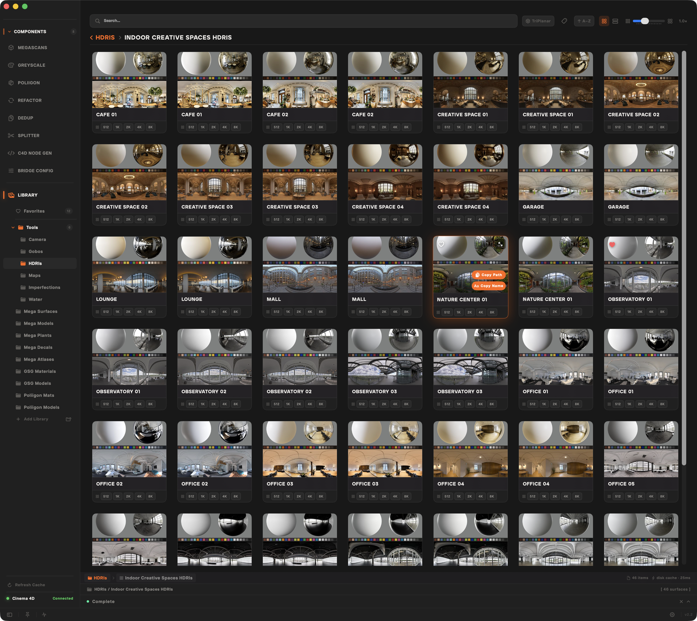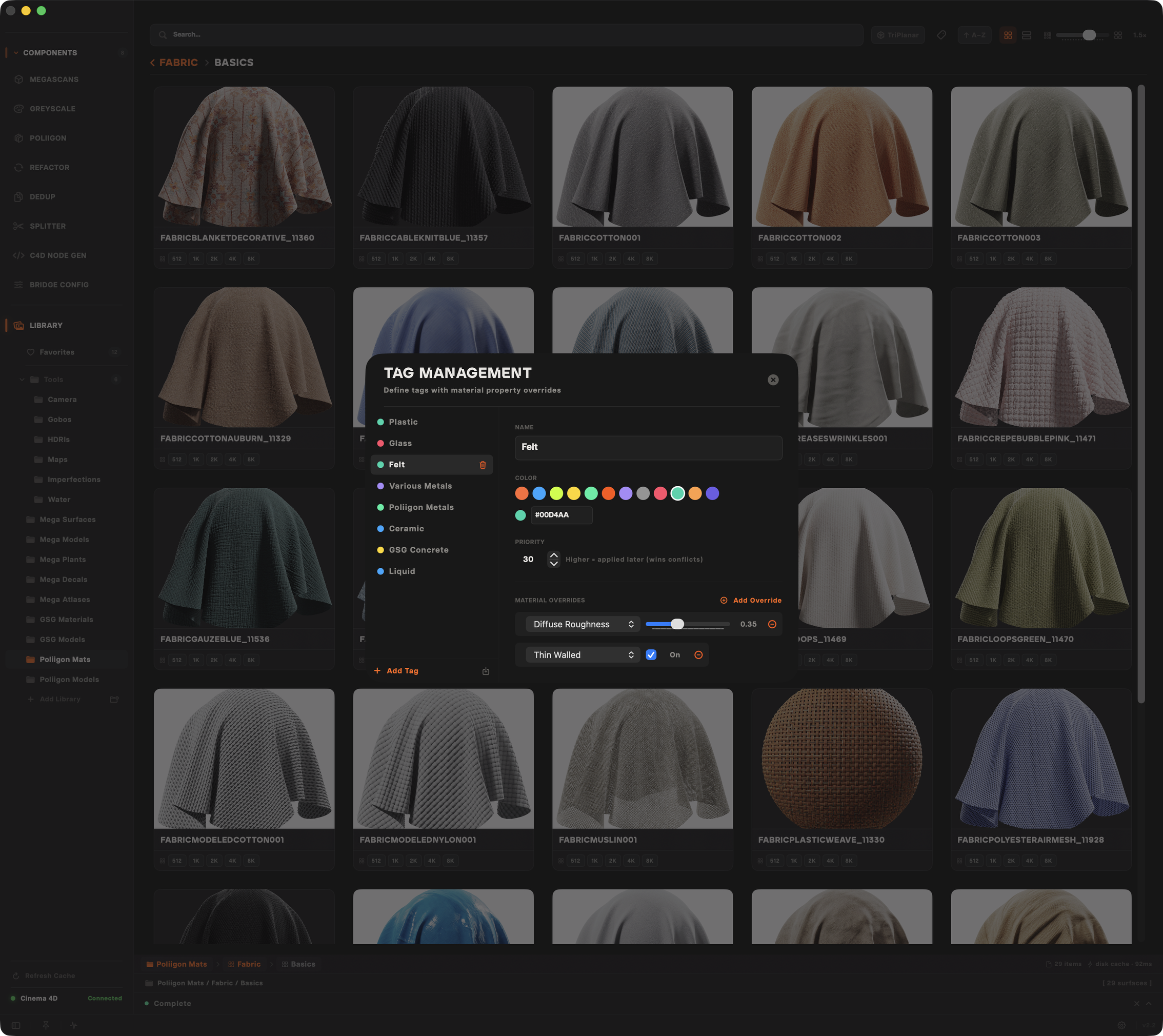 I wanted to build something better. Not just a library. A Swiss Army knife for 3D asset management. A system that could ingest assets on macOS or Windows and push them directly into Cinema 4D with the right logic already in place. Metals arrive with the correct Index of Refraction. Plastics carry the right subsurface scattering. Plants come in with vertex maps ready to move in the wind. No rebuilding. No repetitive setup. No digging through layers of menus to make basic changes.
